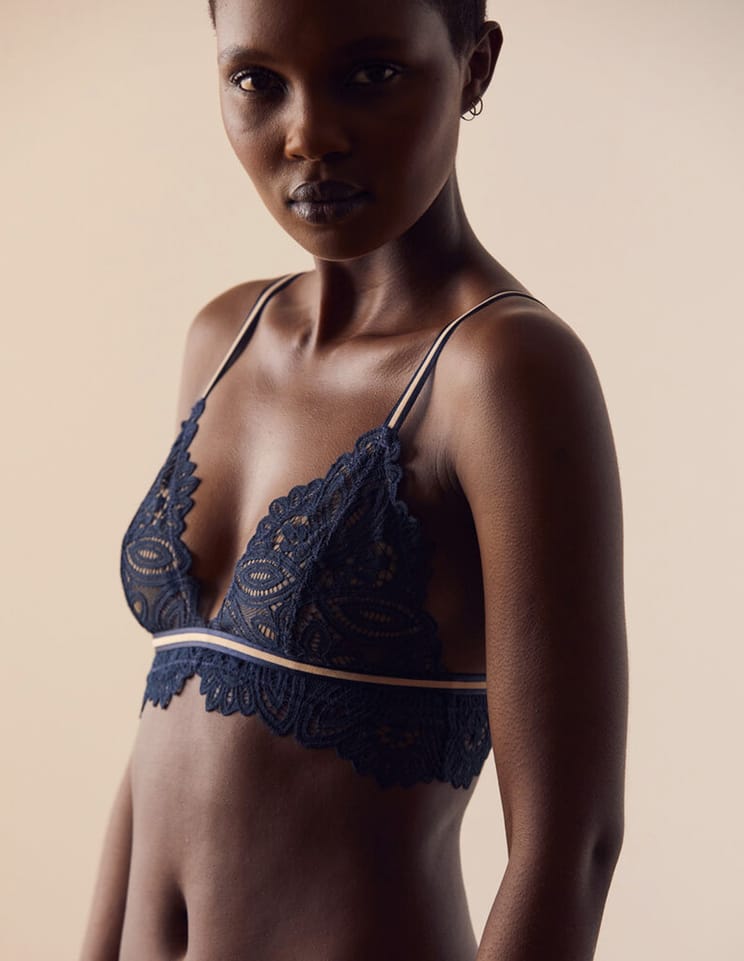 Wygodny i seksowny miękki biustonosz z elastycznej koronki w kwiaty z gumką i cienkimi dwukolorowymi ramiączkami. Naturalne wsparcie klatki piersiowej.